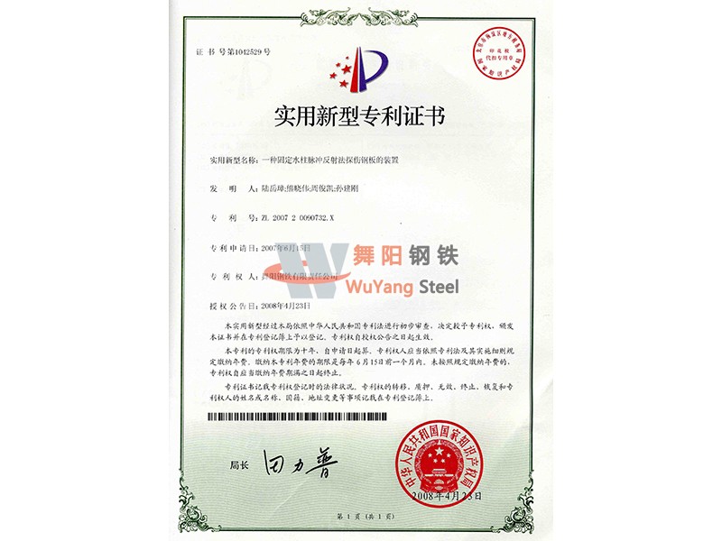 舞陽鋼鐵公司一種固定水柱脈沖反射法探傷鋼板的裝置-實(shí)用新型專利證書